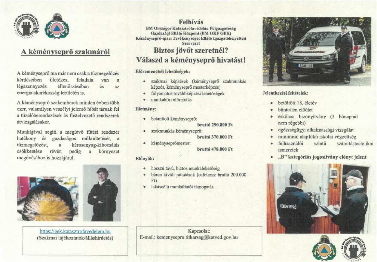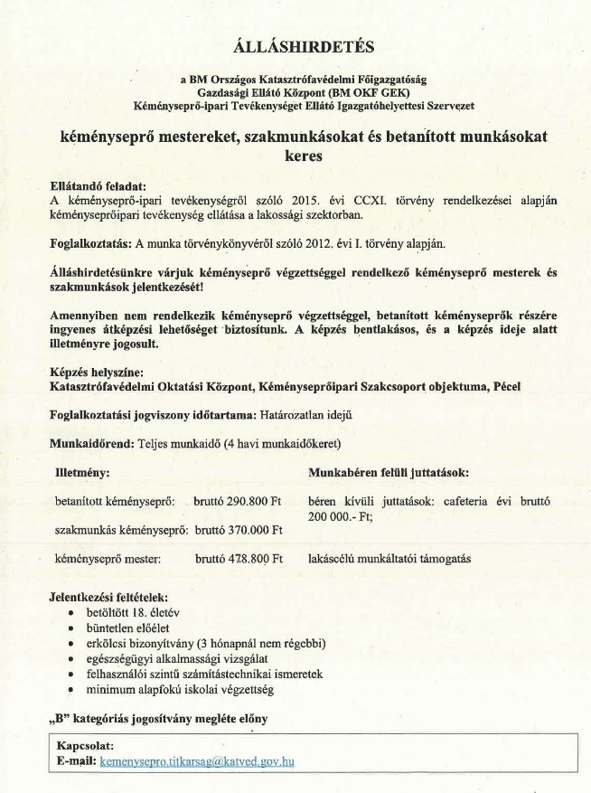 .lláshirdetés a BM Országos Katasztrófavédelmi Főigazgatóság Gazdasági Ellátó Központ (BM OKF GEK) Kéményseprő Ipari Tevékenységet Ellátó Igazgató-helyettesi Szervezet kéményseprőmester / kéményseprő szakmunkás / kéményseprő betanított munkás munkakör betöltésére